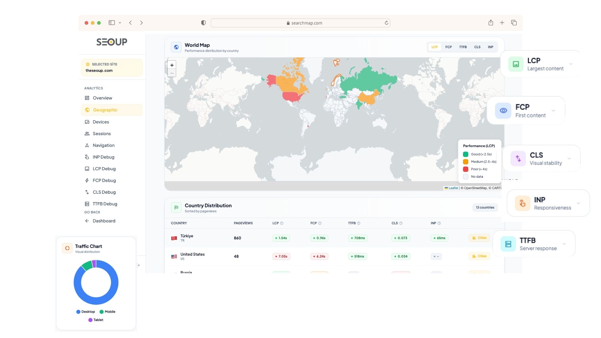 Gerçek kullanıcı davranışlarına dayanan verilerle, sayfa hızınızı ve kullanıcı deneyimini anlık olarak ölçer; performansın sahada nasıl çalıştığını net biçimde ortaya koyar.